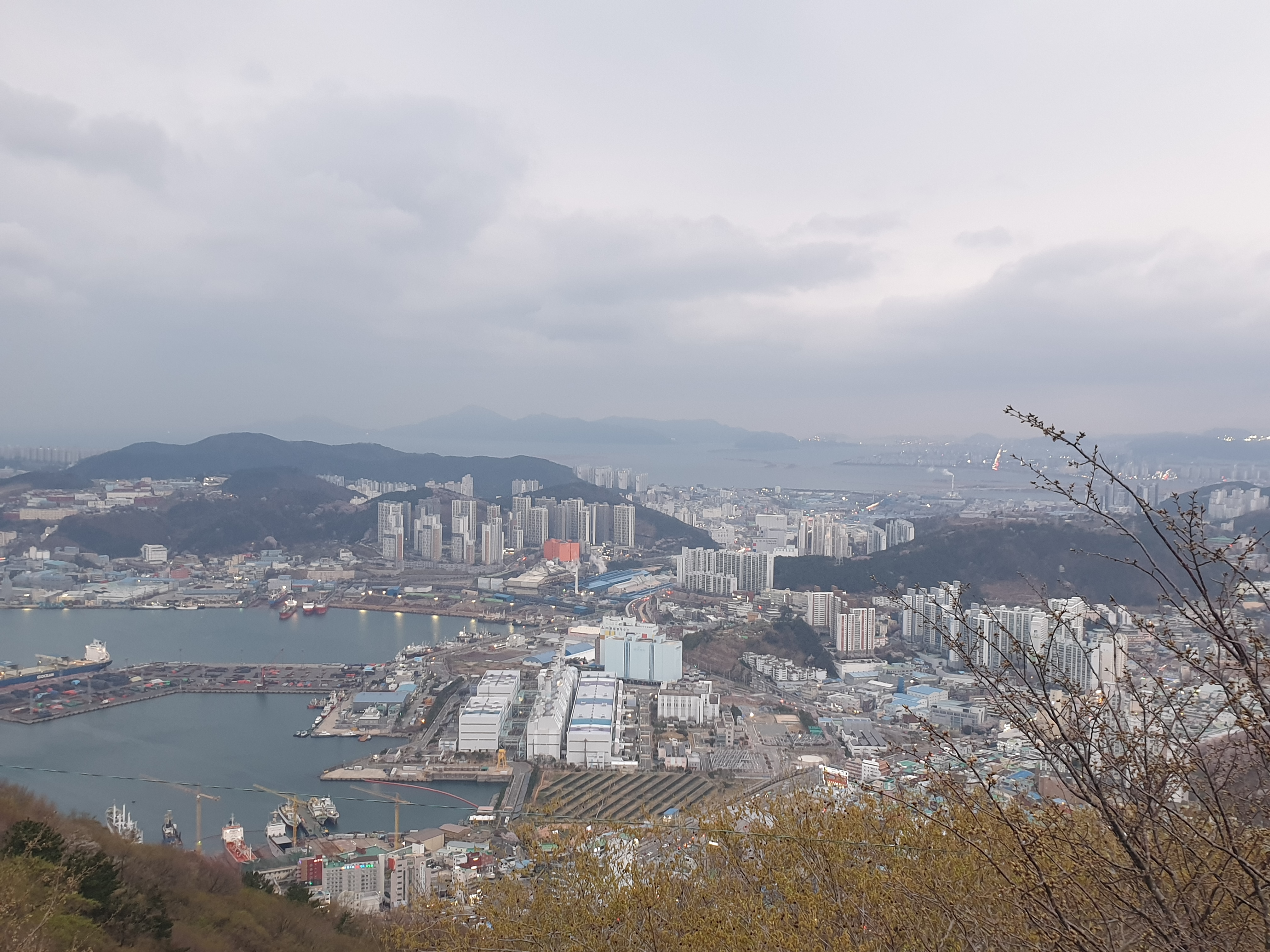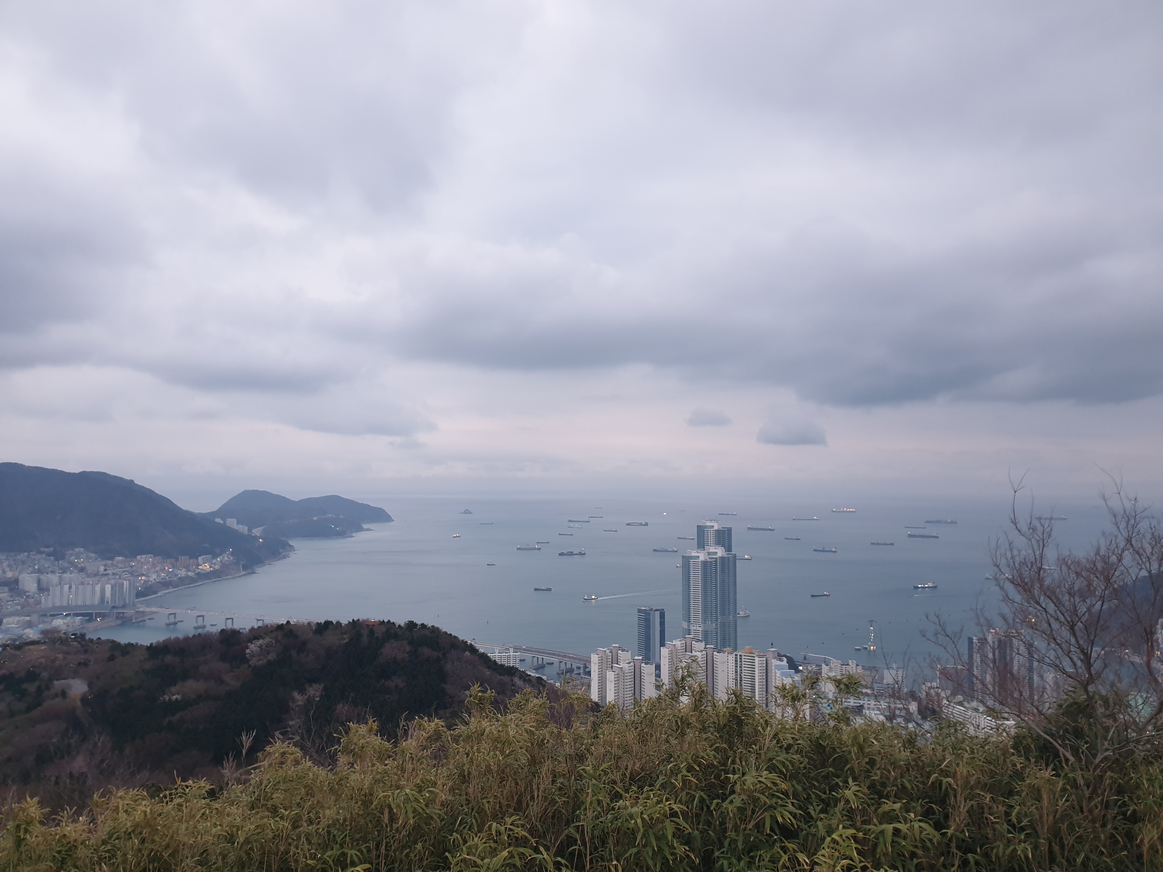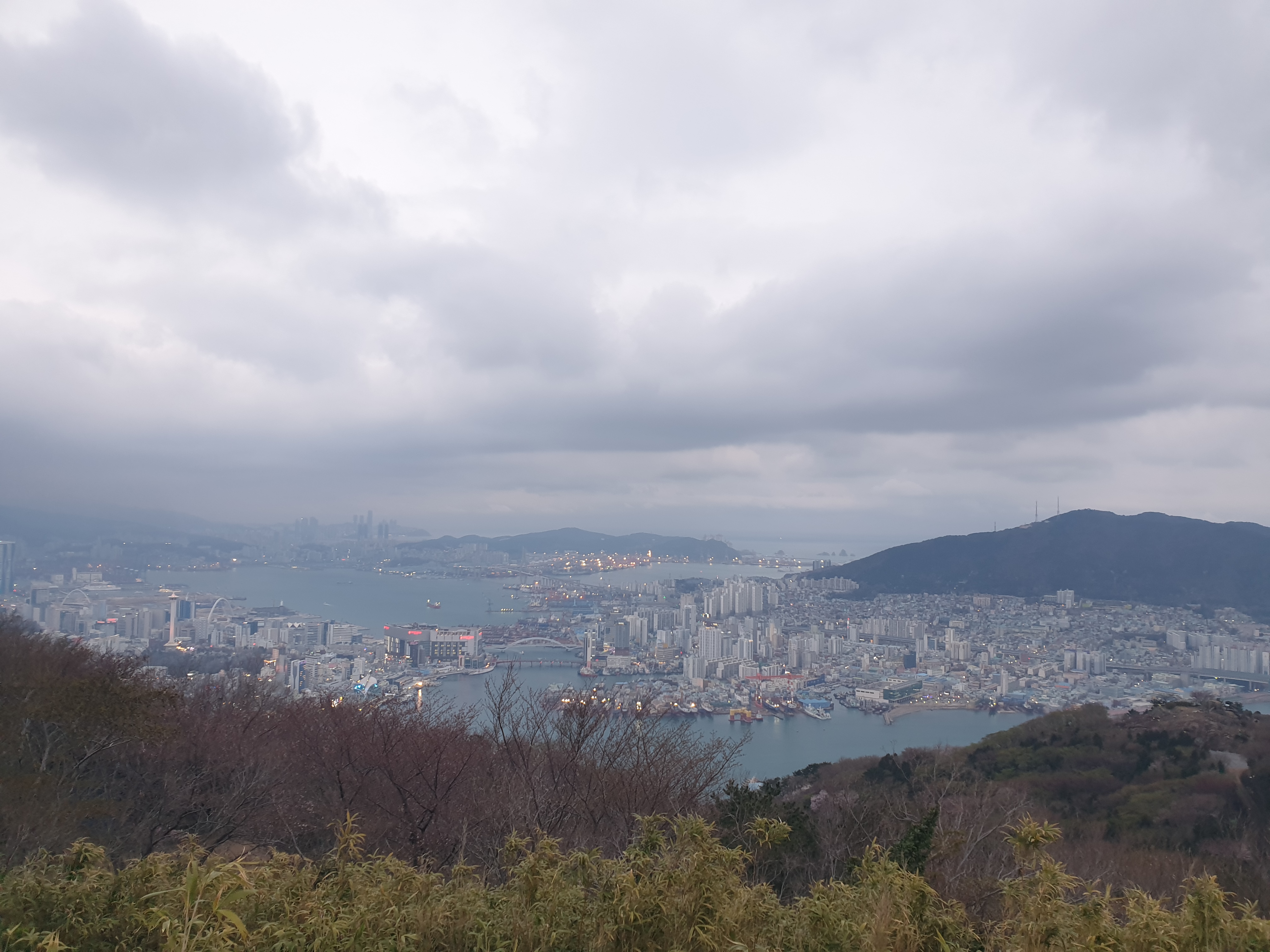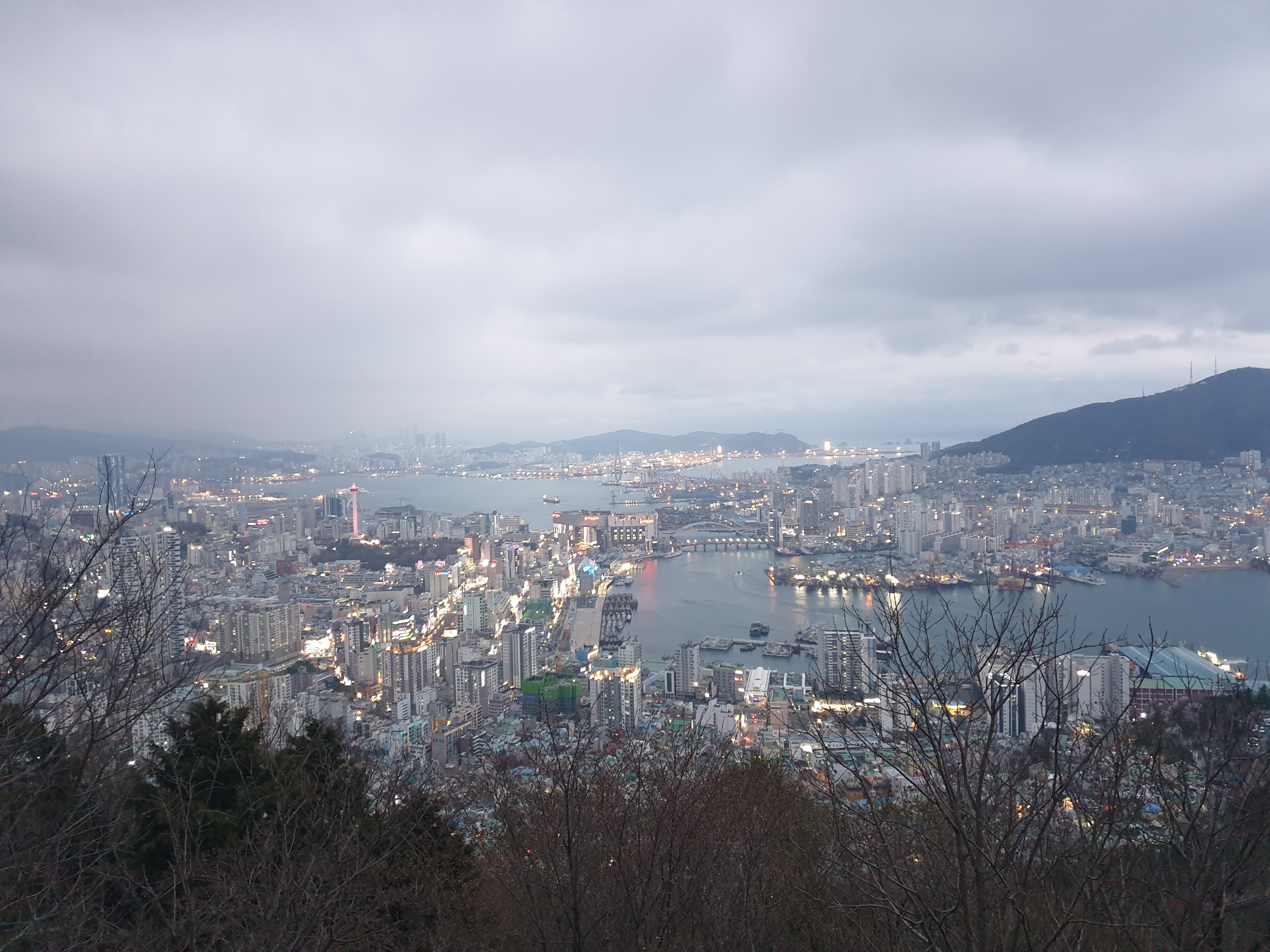영도와 부산항 앞바다를 볼 수 있는 조망. 조금씩 어두워 지고 있어 항구 쪽에 불빛들이 밝혀지고 있다.