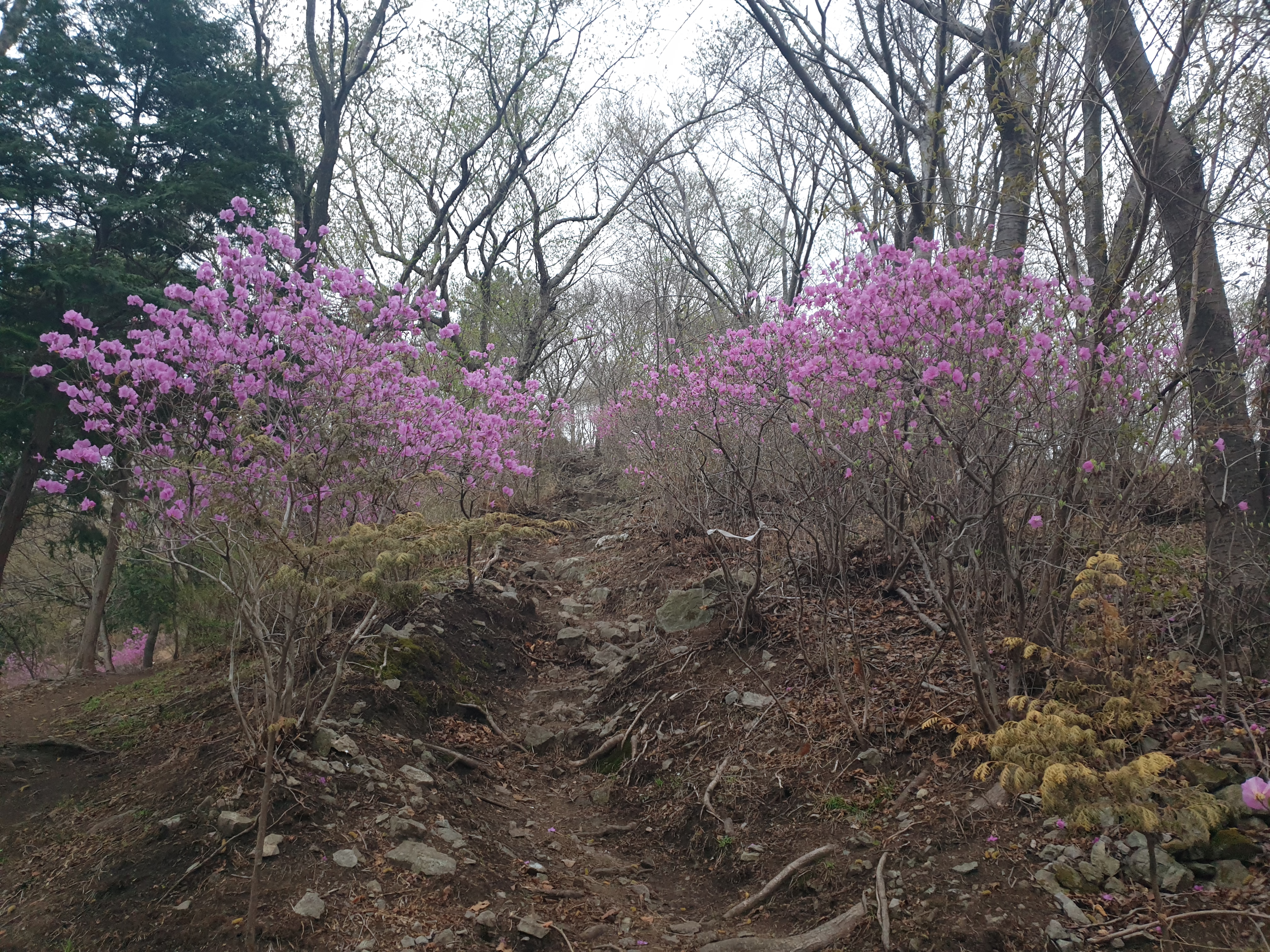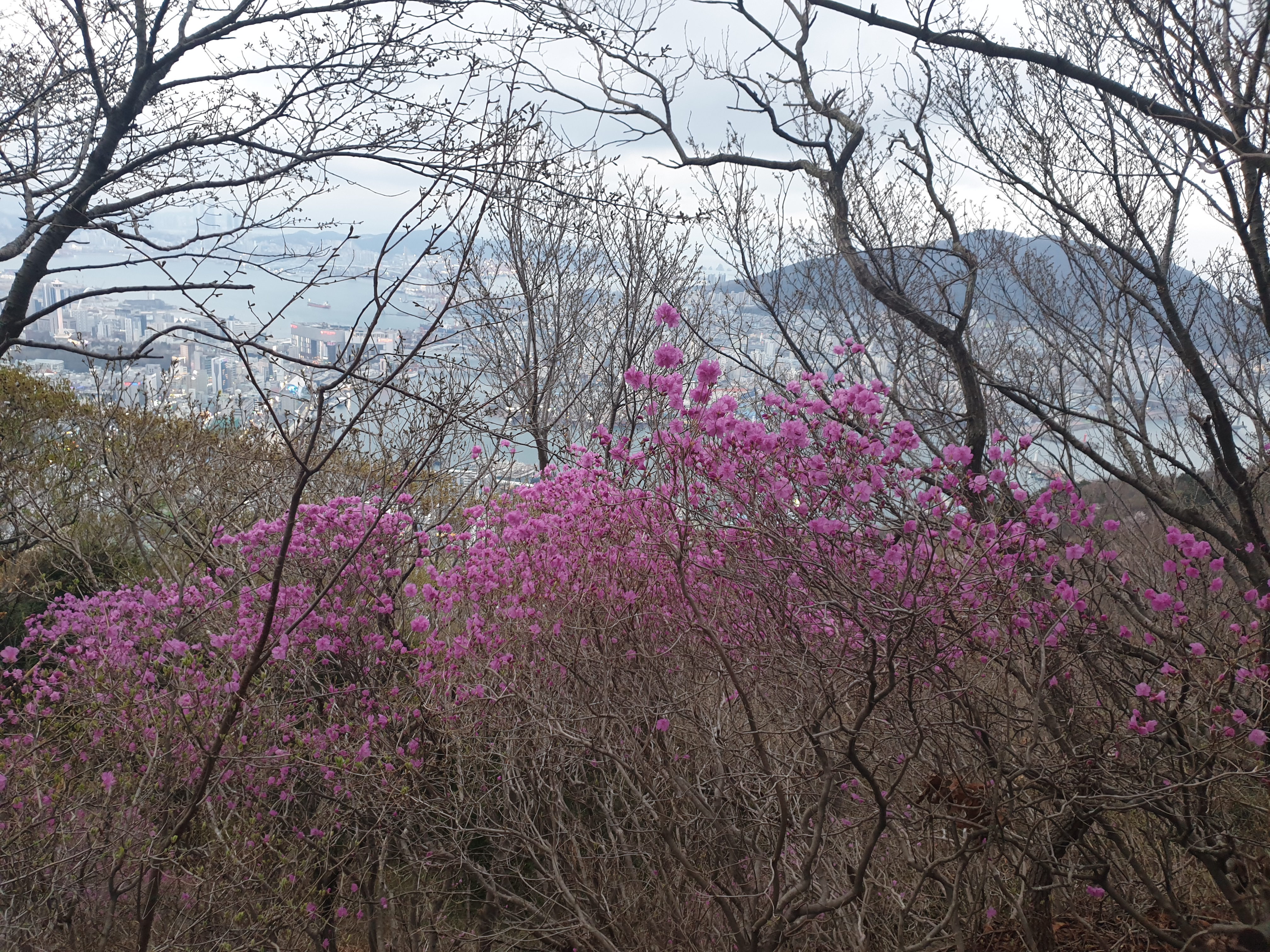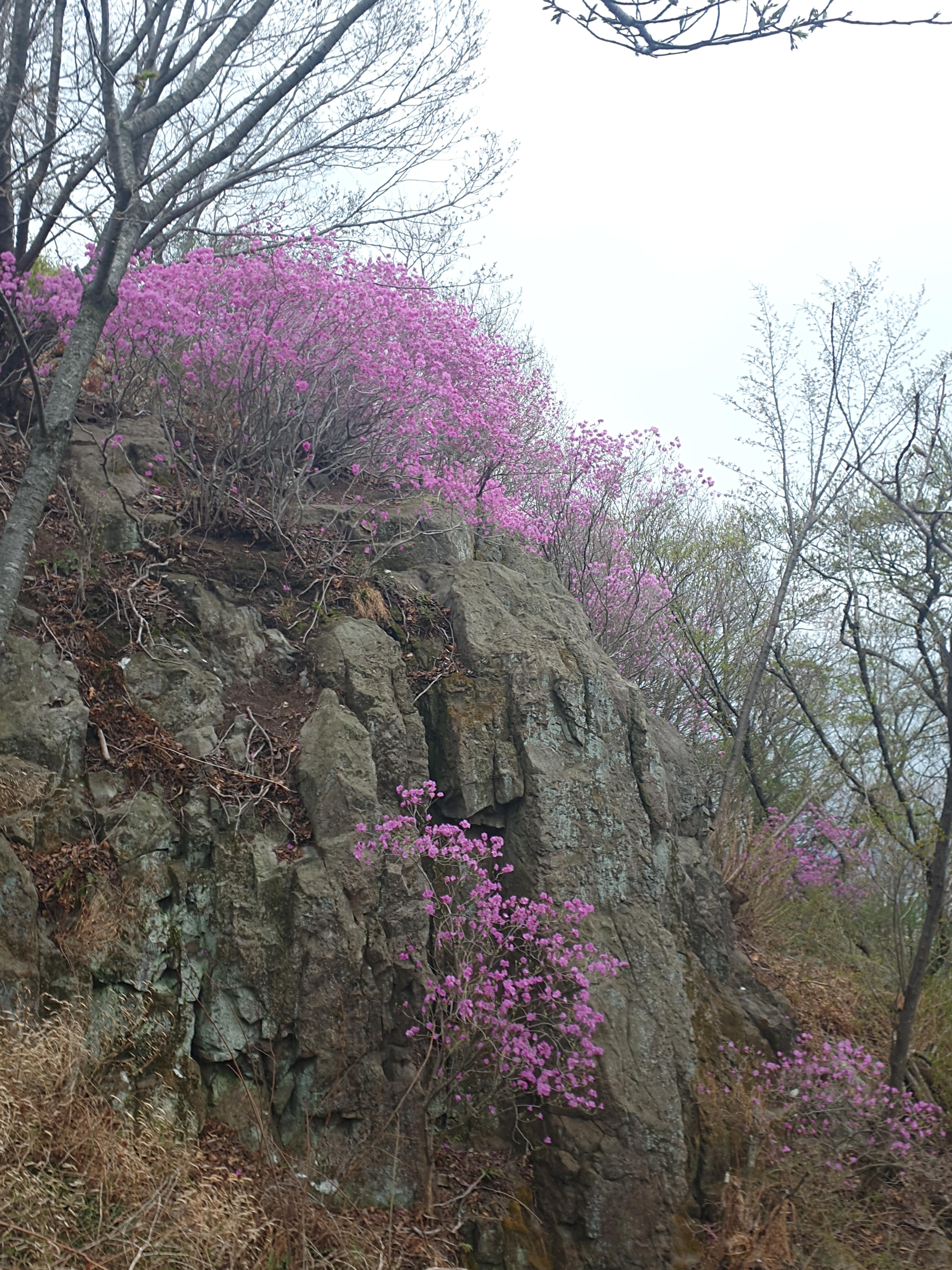 저녁 약간 어둑어둑해진 시간임에도 진달래의 화사한 빛깔이 등산로를 환하게 물들이고 있다. 바다를 배경으로 분홍빛의 진달래도 푸른색에 대비되어 더욱 화사해 보이는 듯하다.