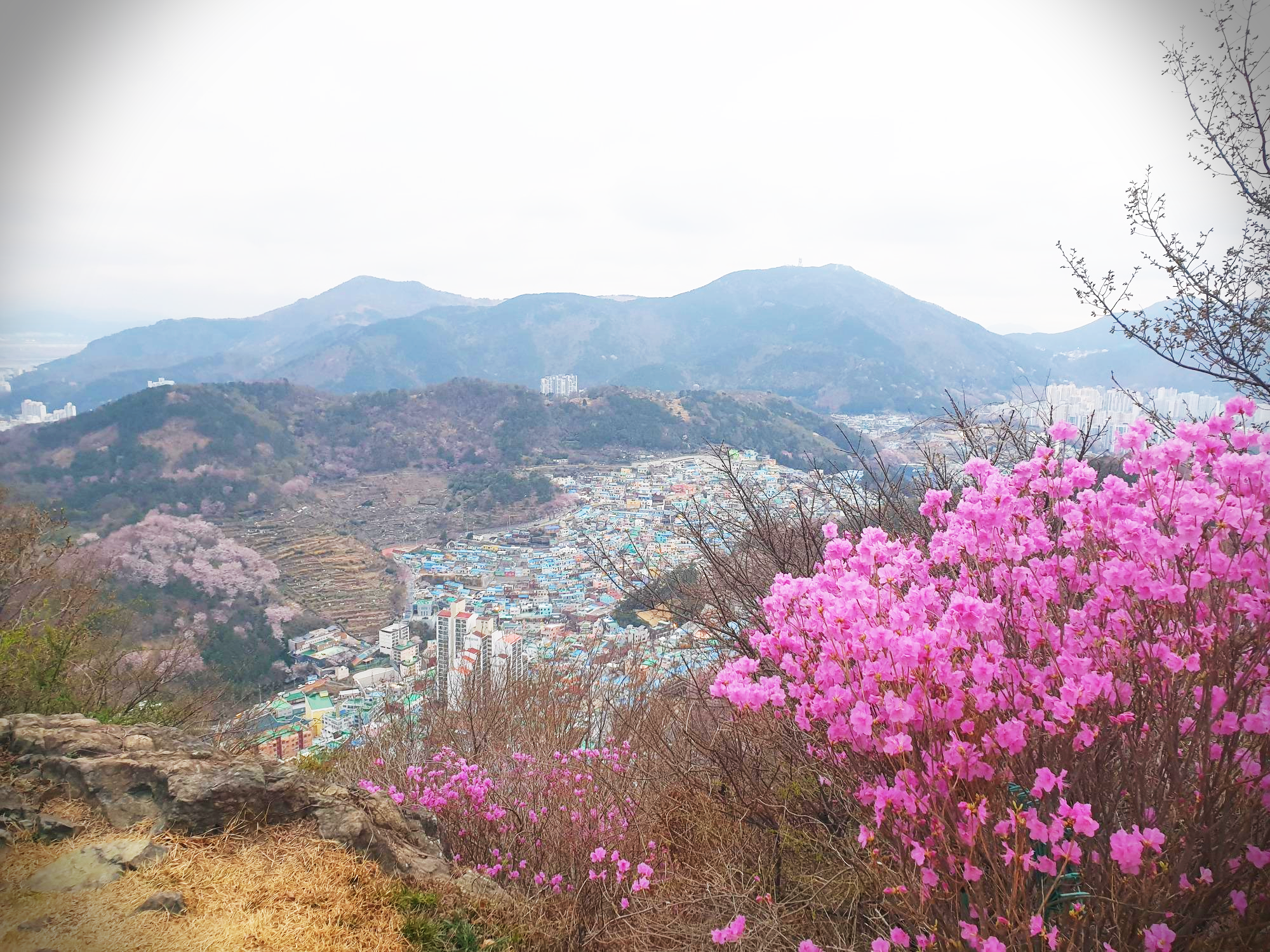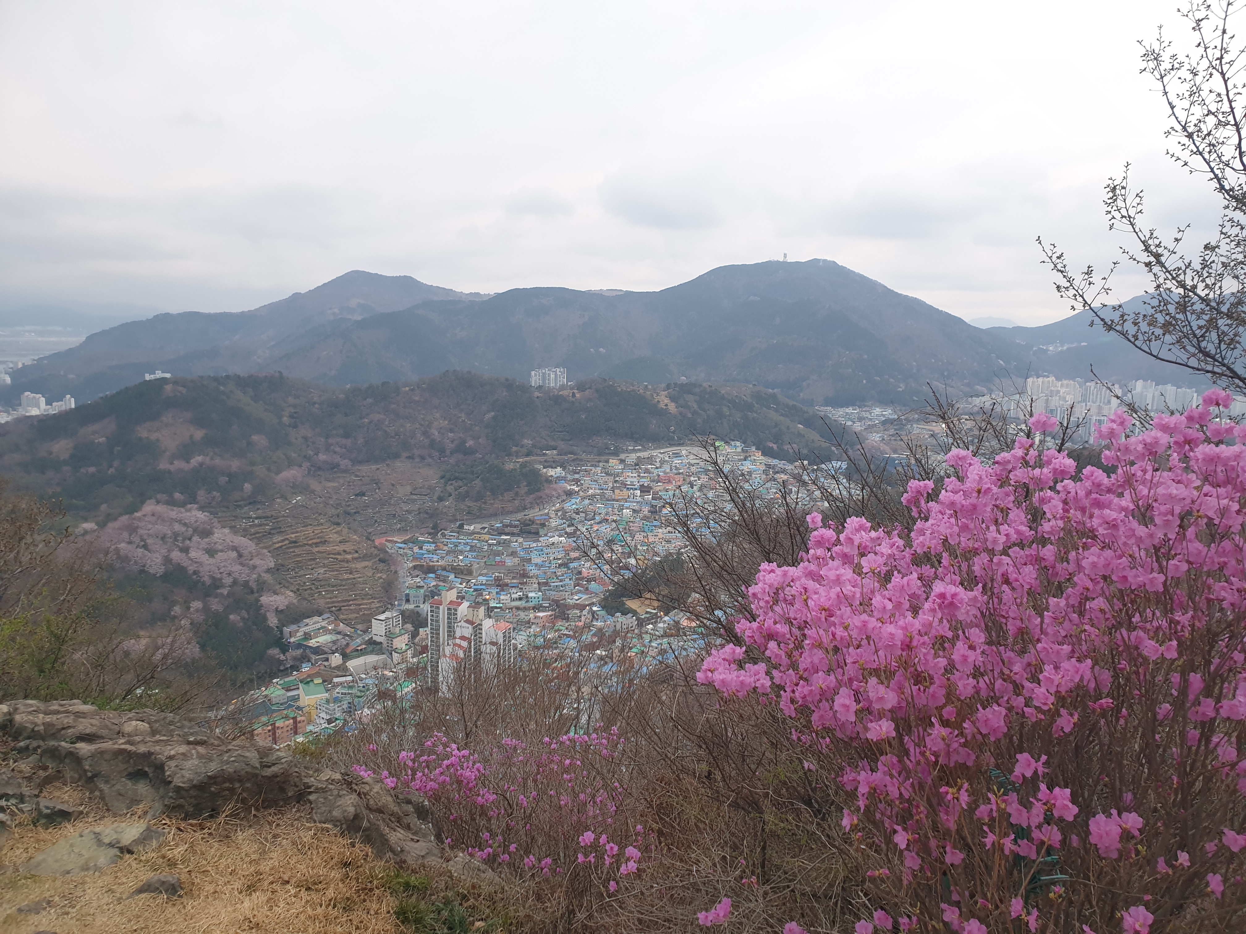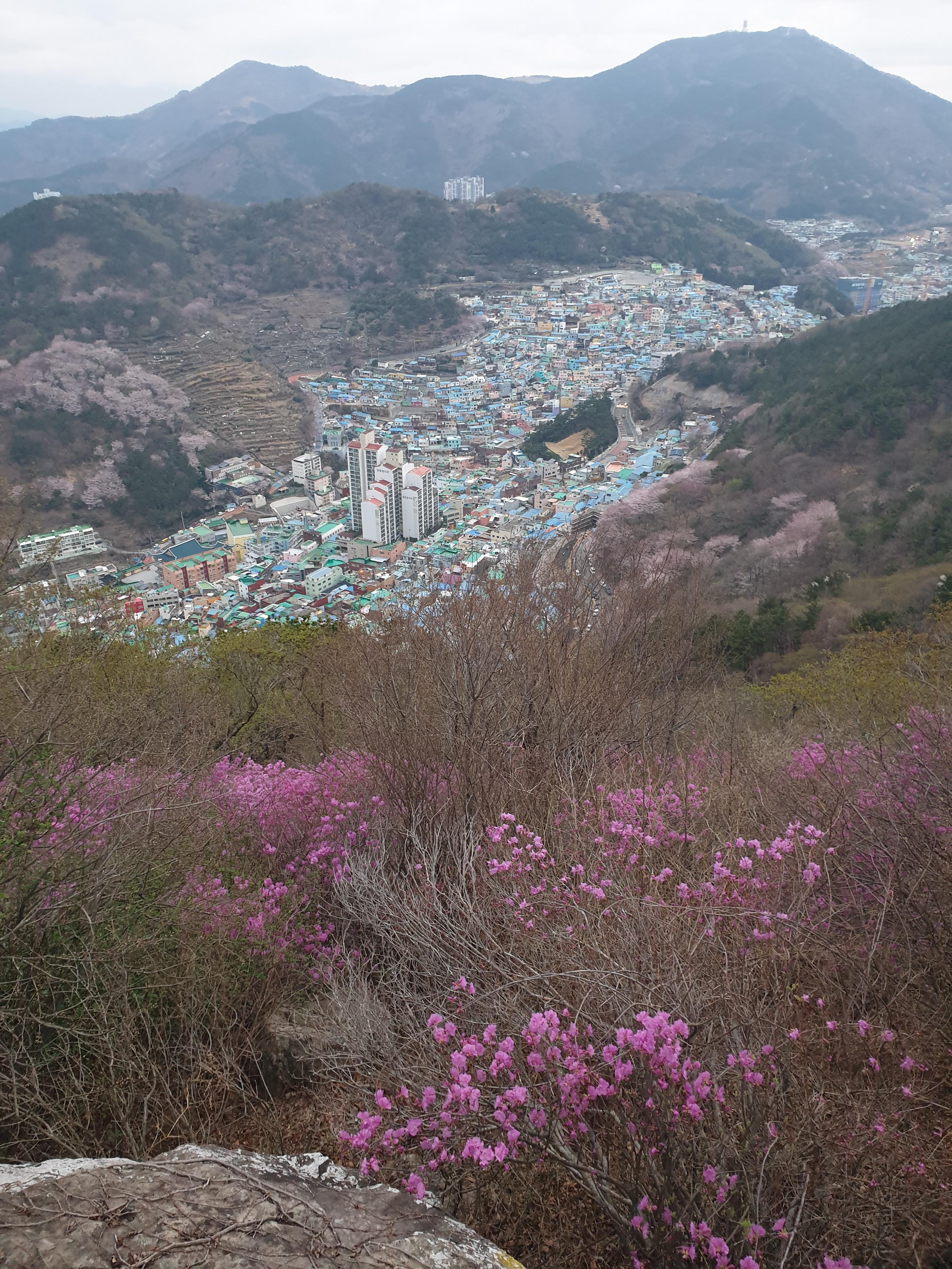 정상 직전 또 하나의 풍경이 눈길을 끈다. 진달래 꽃 너머로 감천고개를 빼곡히 채우고 있는 문화마을이 한눈에 조망된다.