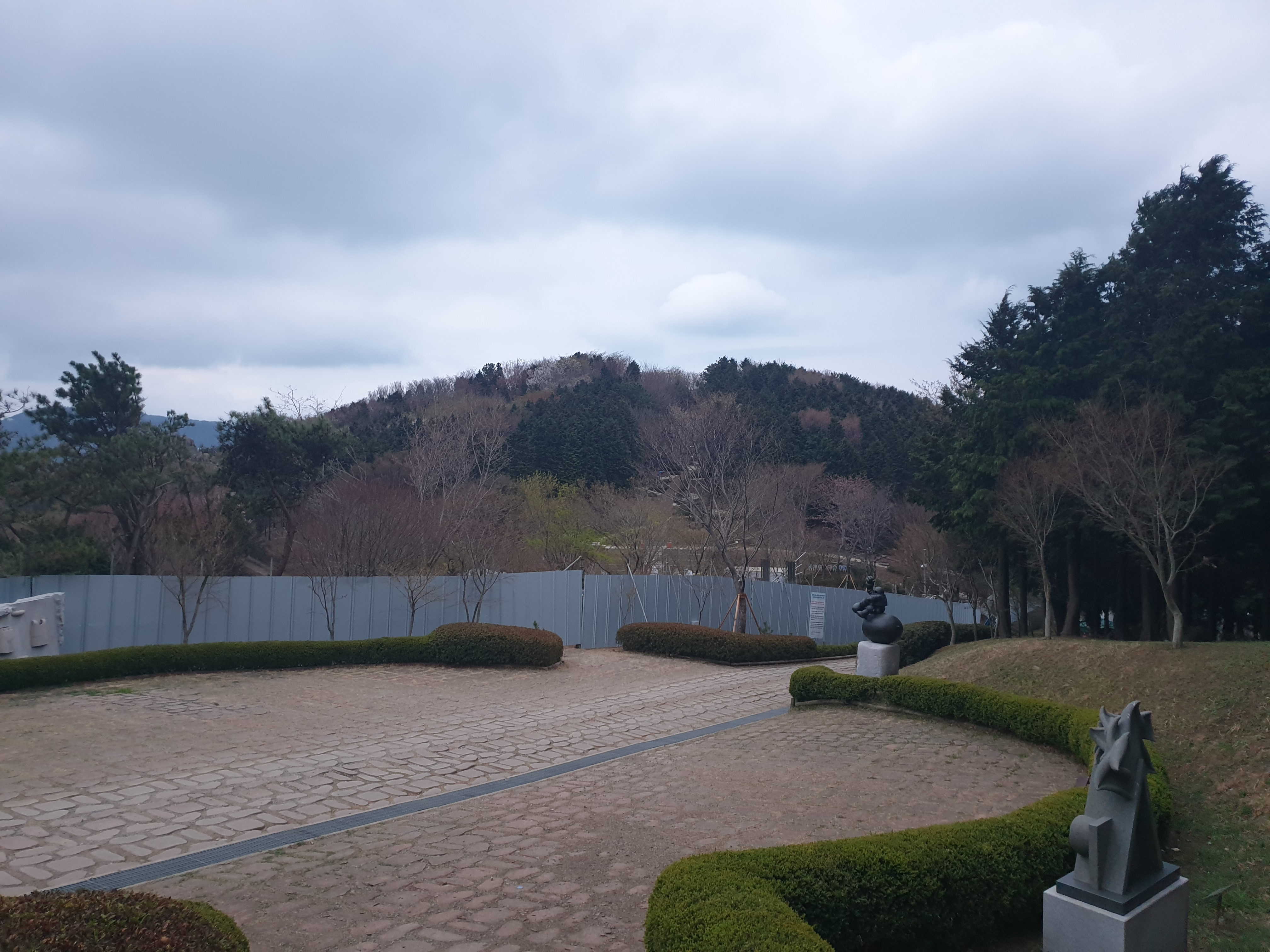 모노레일 공사로 인해 조각공원은 가림막으로 출입이 통제되어 있다. 여기서 임도를 따라 출발지로 되돌아간다.